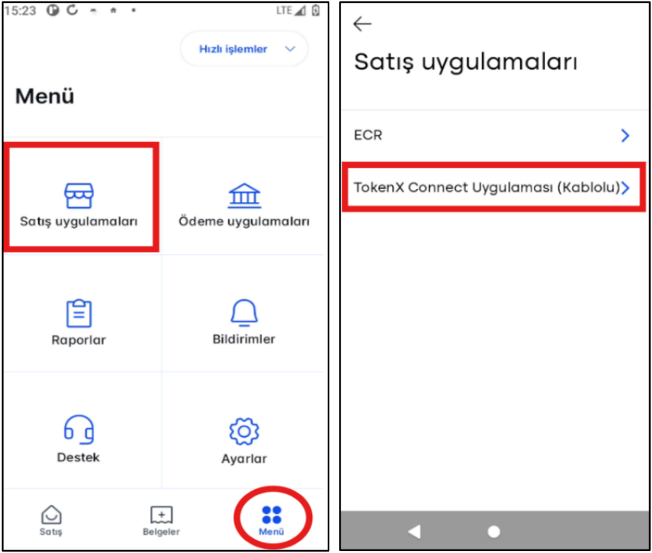 İşletme tarafından ödemesi gerçekleşen cihazda Entegrasyon Onaylı Platform yazılımı ve TokenX Connect uygulaması otomatik atanır. Uygulama atandığında aşağıda tariflendiği şekilde Menü > Satış Uygulamaları > TokenX Connect Uygulaması (Kablolu) seçilmelidir.