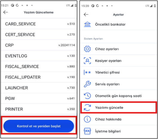 - Cihazda onaylı uygulama atanmış fakat yüklü değilse Menü > Ayarlar > Yazılım güncelle > “Kontrol et ve yeniden başlat” seçilir.