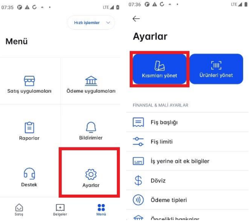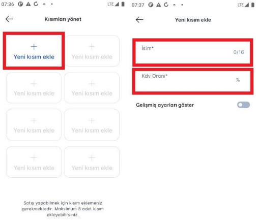 • Cihaz ana ekrandayken Ayarlar>Kısımları Yönet>Yeni Kısım Ekle tıklandıktan sonra Kısım ve KDV oranları entegrasyon yapılan satış otomasyon firmasının tarif ettiği şekilde tek tek ayarlanır ve “Kaydet” e tıklanır.
